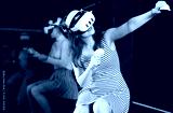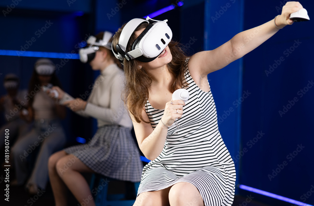 Cheerful emotional young female in VR goggles sitting in virtual reality room with group of friends, manipulating objects or shooting at targets with gaming controllers in hands..