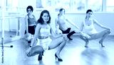 Women wearing casual activewear performing sensual and modern high heels choreography during group class in dance studio