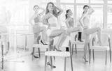 Leaning on chair seat with hand foot, girl in tank top and shorts performs lap dance during group workout. Master class on inveiglement men by demonstrating sexy body, pumping skills
