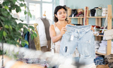 Positive young woman chooses fashionable jeans in a clothing store