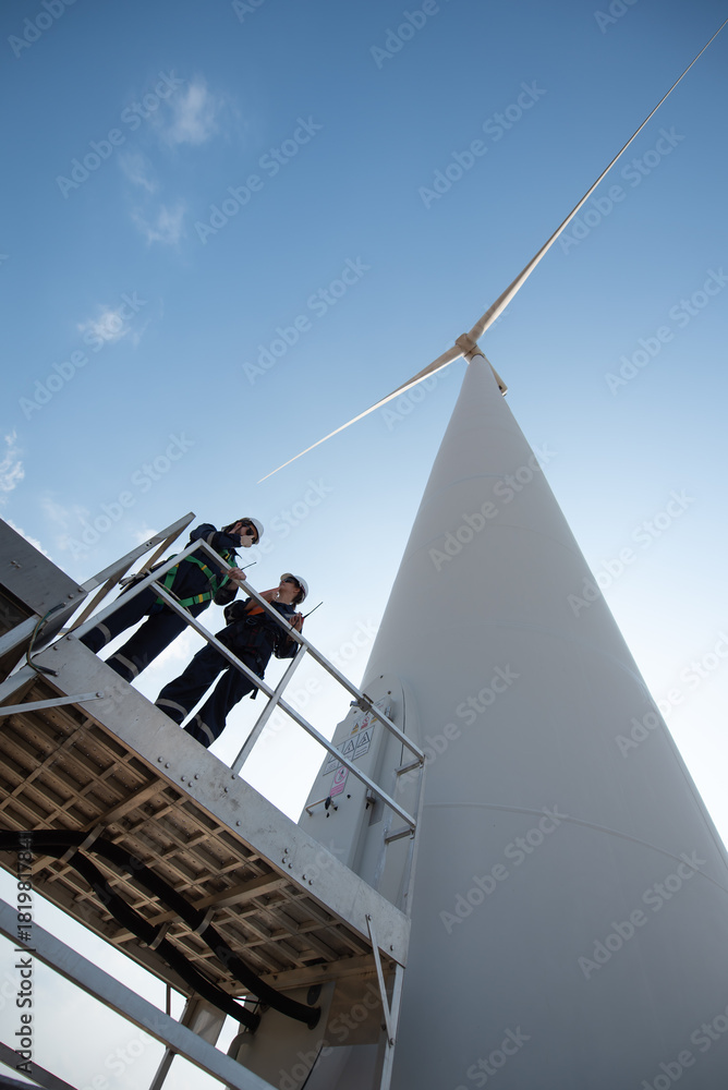 Wind Turbine Maintenance and Repair Technician, Engineer Checking Turbines working maintenance clean power generator system