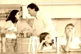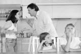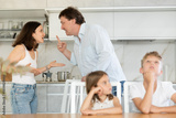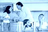 Couple sort things out and yell at each other in kitchen. Parents quarrel behind back of their son and daughter. Children are blurred unrecognizable