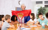 Mature high school woman teacher tells pupils the history of Serbia in class and holds the national flag of the country