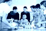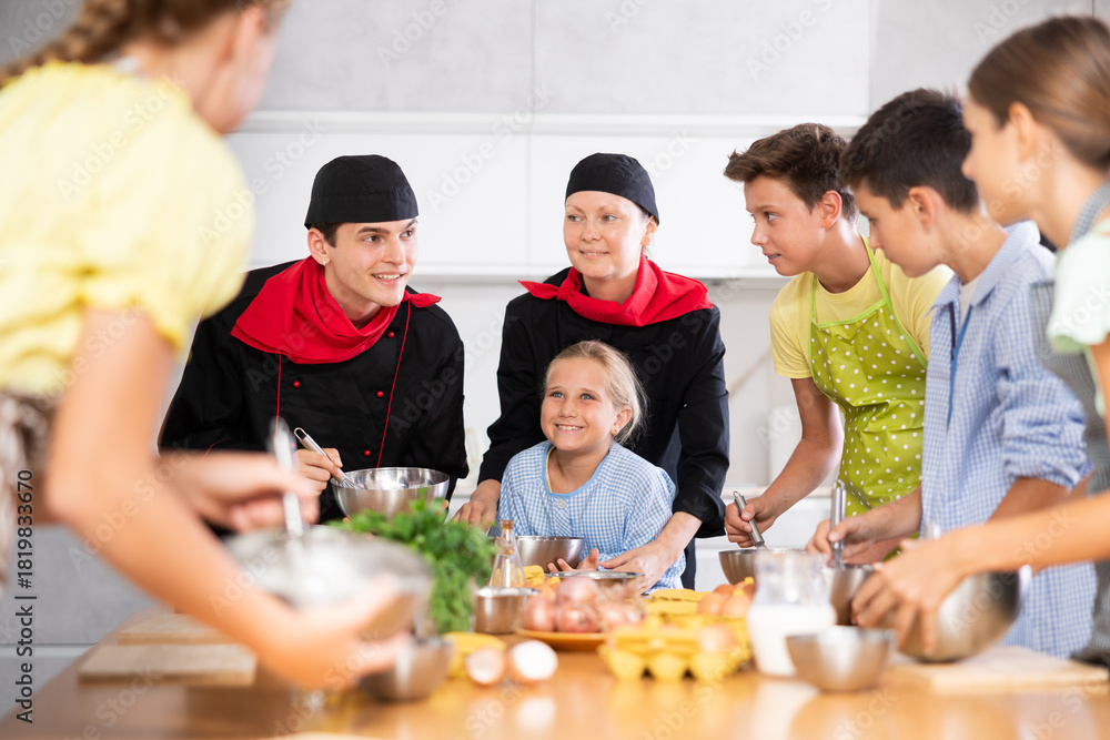 Cheerful enthusiastic woman and young man, skilled chefs wearing black jackets and caps, conducting culinary masterclass for teenage children, sharing secrets of cooking