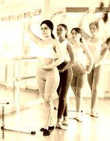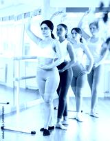 Motivated girl in twenties mastering fourth position while standing at barre in well-lit choreography studio during group training of young female ballet enthusiasts