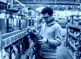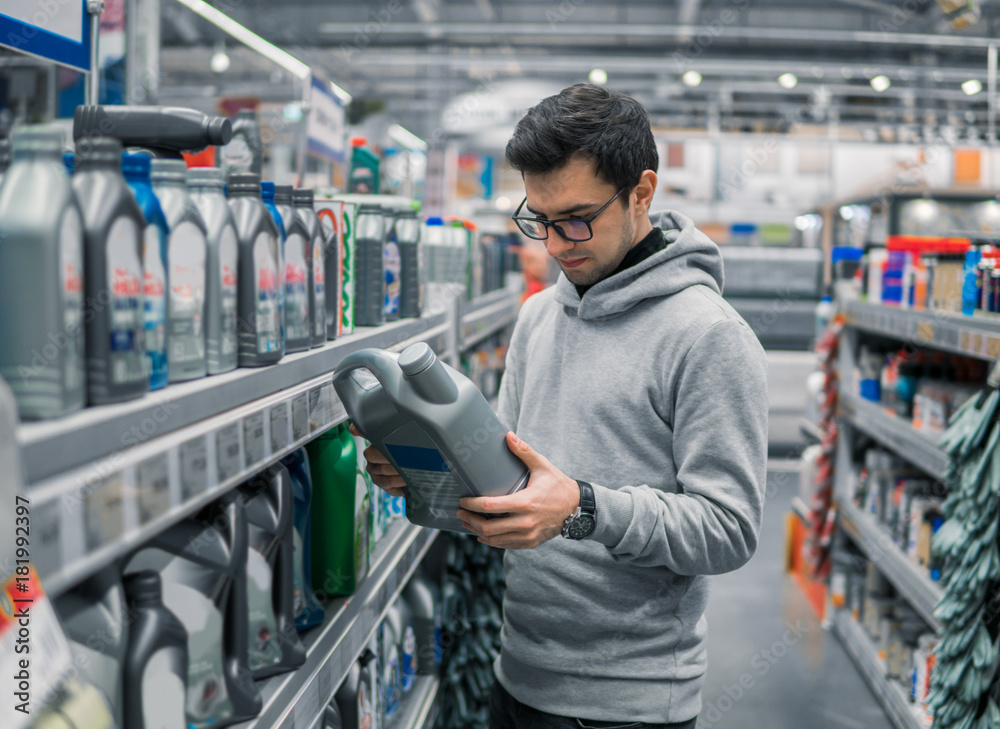 male customer buying engine lubricating oil in the car supermarket. Difficult decision which motor oil to buy