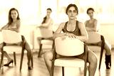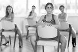 Confident young girl in casual sportswear and high heels balancing grace, sensuality and femininity while practicing lap dance moves on chair in well-lit studio with group of fellow female dancers