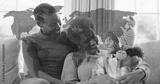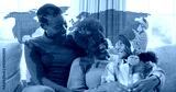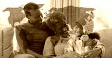 Hugging three-gen family wearing knit sweaters and pom-pom hat on light sofa, red world map overlay