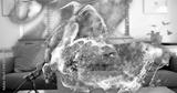 Recording man in striped shirt sitting on sofa at home speaking into mic, laptop, purple overlay