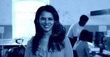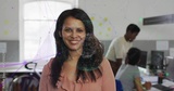 Smiling woman in salmon ruffled blouse facing camera at office, showing network overlay and bicycle