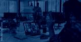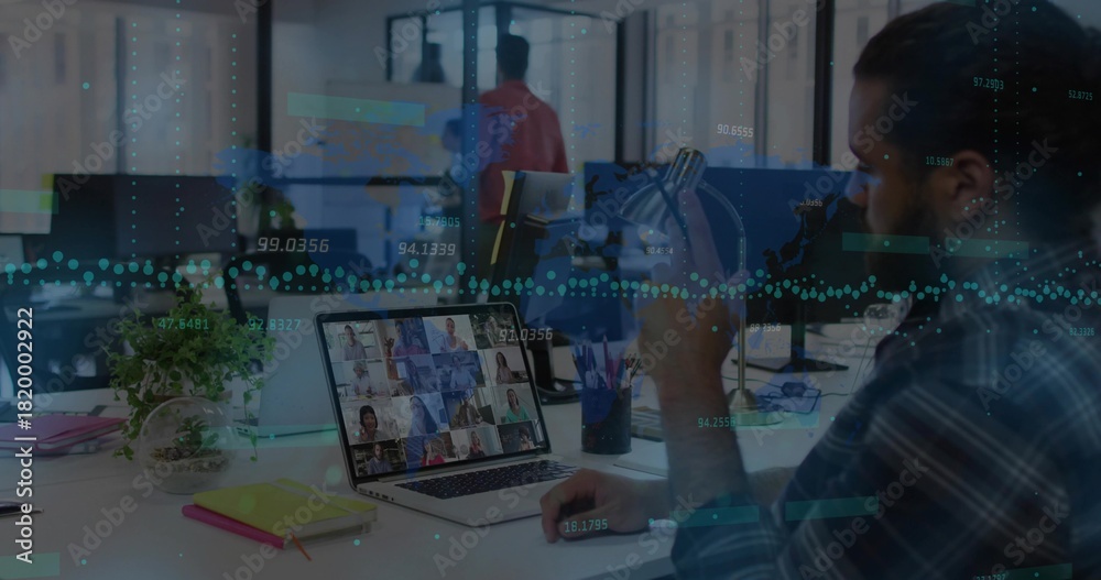 Holding mug, mid adult man wearing plaid shirt viewing laptop meeting grid at office, copy space