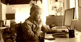Typing office worker wearing olive shirt and tied dreads at office desk, with monitor and laptop