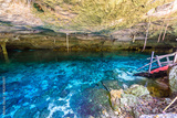 Cenote Dos Ojos in Quintana Roo, Mexico. People swimming and snorkeling in clear water. This cenote is located close to Tulum in Yucatan peninsula, Mexico.