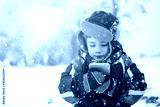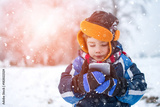 Little boy in winter wear using phone or tablet on cold snowy day.