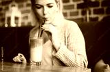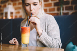 Young woman sipping a healthy smoothie in a restaurant.