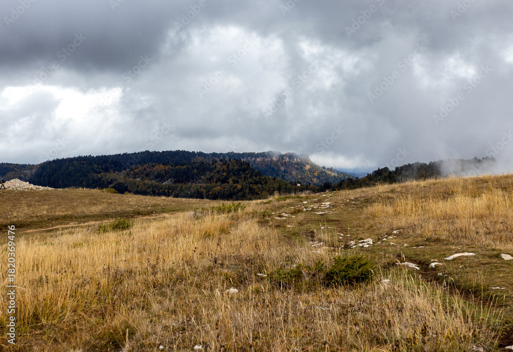 Autumn walks in the autumn park in the morning hours in the alpine area of the mountain range