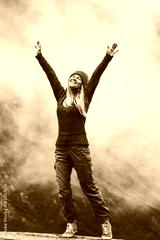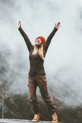 Happy woman in foggy mountains Travel Lifestyle success motivation concept adventure active vacations outdoor blessing emotions raised hands