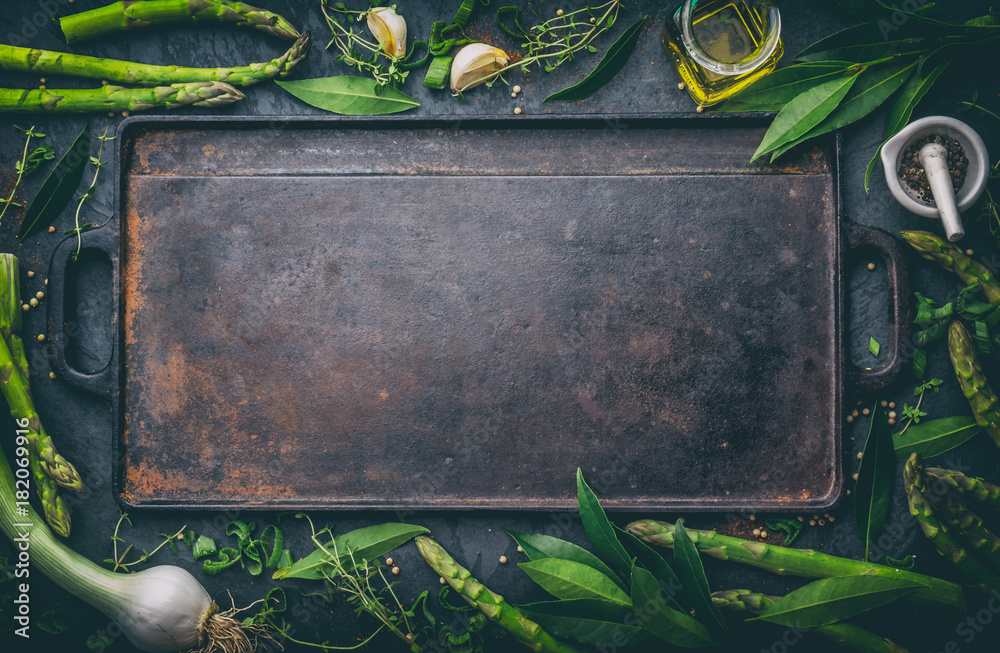 Food background with free space for text. Herbs, olive oil, spices around cast iron frying board. Top view
