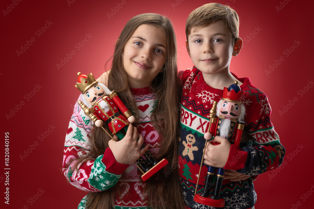 Joyful Children Boy and Girl In Festive Christmas Sweaters Hold Nutcracker Toy Figures For Happy Holiday Photo, New years eve and Family time