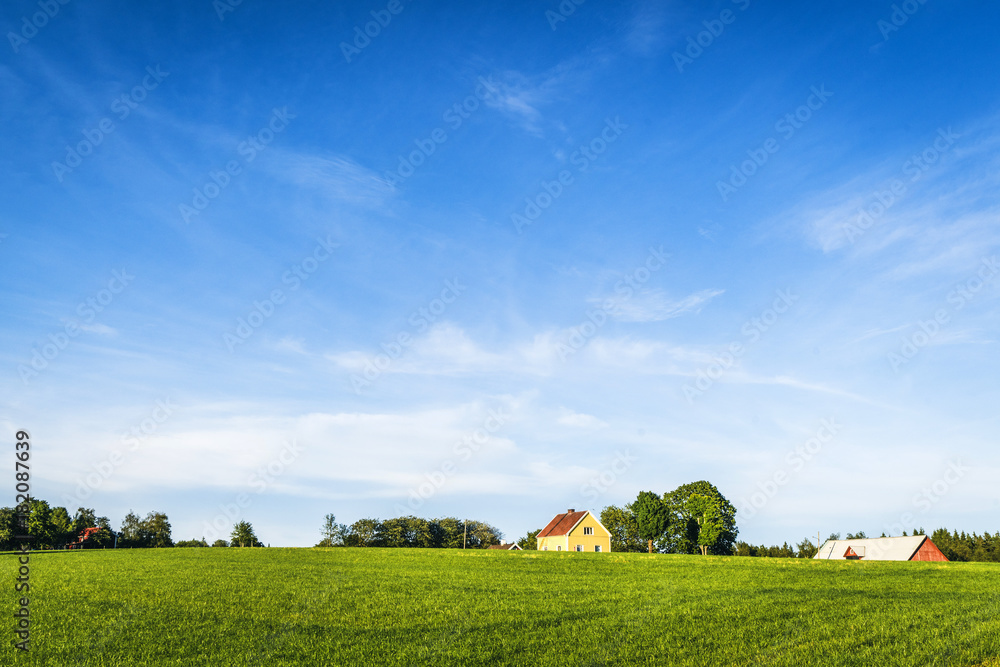 Yellow farmhouse on a rural green field