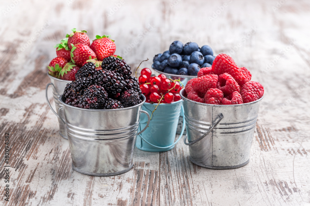 Colorful berries assortment in five tin cans on rustic wooden table blueberry, raspberry, red currant, strawberry, in five old tin cans on rustic wooden table in studio