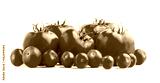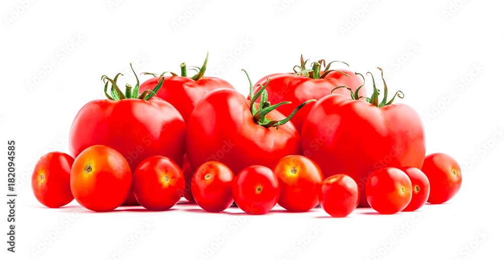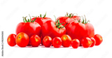 Tomatoes closeup large and small shiny assorted arrangement isolated of lined up isolated on white background in studio