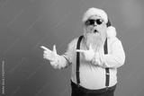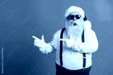 Santa Claus in a thick white beard red suspenders and white gloves wears a hat and cool sunglasses against a bright blue background