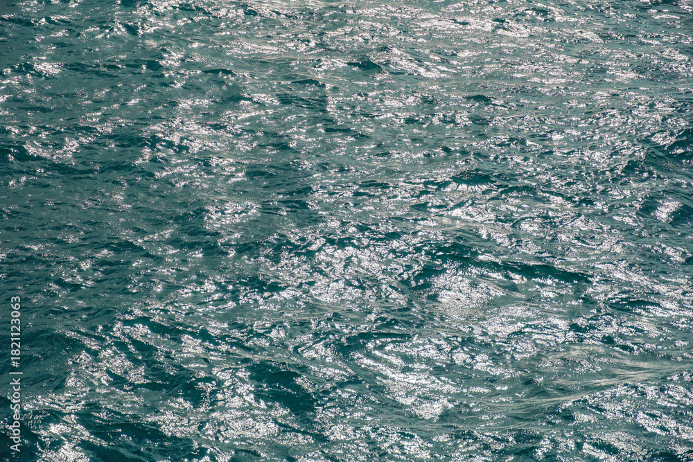Sea wave texture close up. Dark blue water surface with ripples background. macro blue wave pattern in a river with motion blur. Sparkling sunlight reflecting on the surface of a calm.