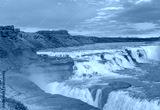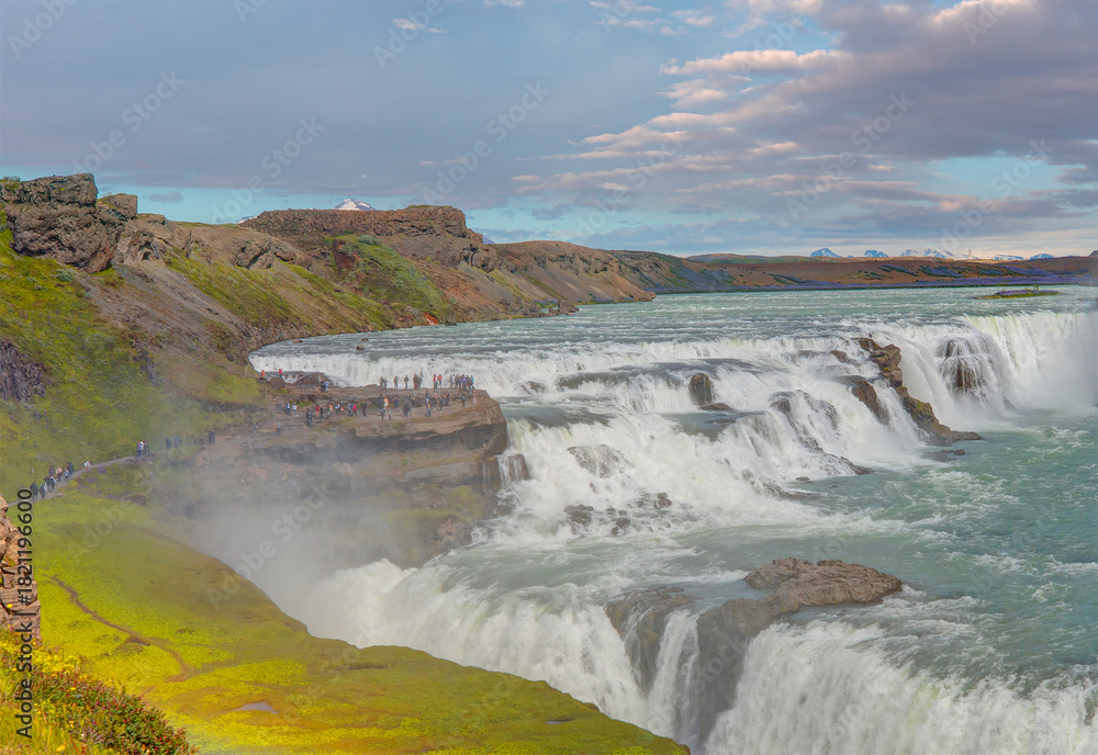 Panoramic view of Gullfoss waterfall on the Hvíta river, a popular tourist attraction and part of the Golden Circle Tourist Route in Southwest Iceland