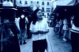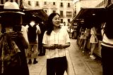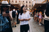 Asian woman holding smartphone at market, glancing to side with calm smile, showing self-awareness, curiosity and digital engagement in dynamic urban setting.
