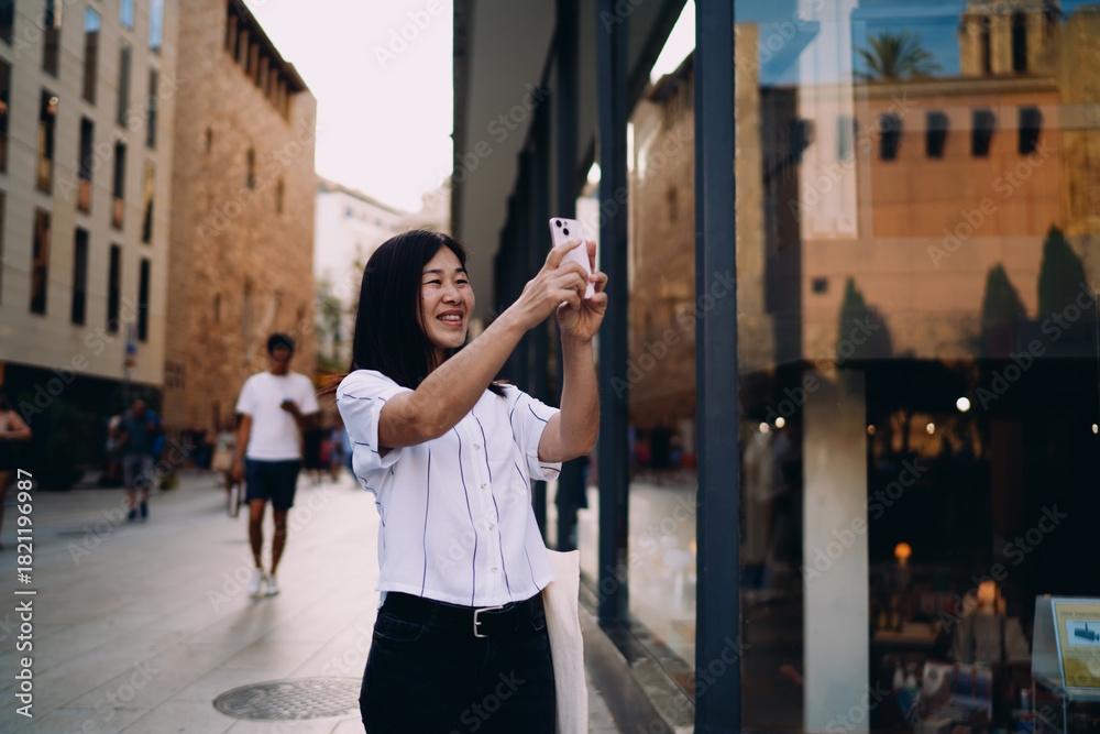 Asian woman smiles while taking selfie with smartphone, representing confidence, mobile culture and joyful expression in everyday digital routine.