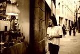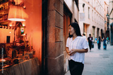 Asian woman looks at vintage display while holding smartphone, embodying slow digital lifestyle, offline inspiration, and mindful tech habits in calm urban discovery.