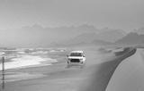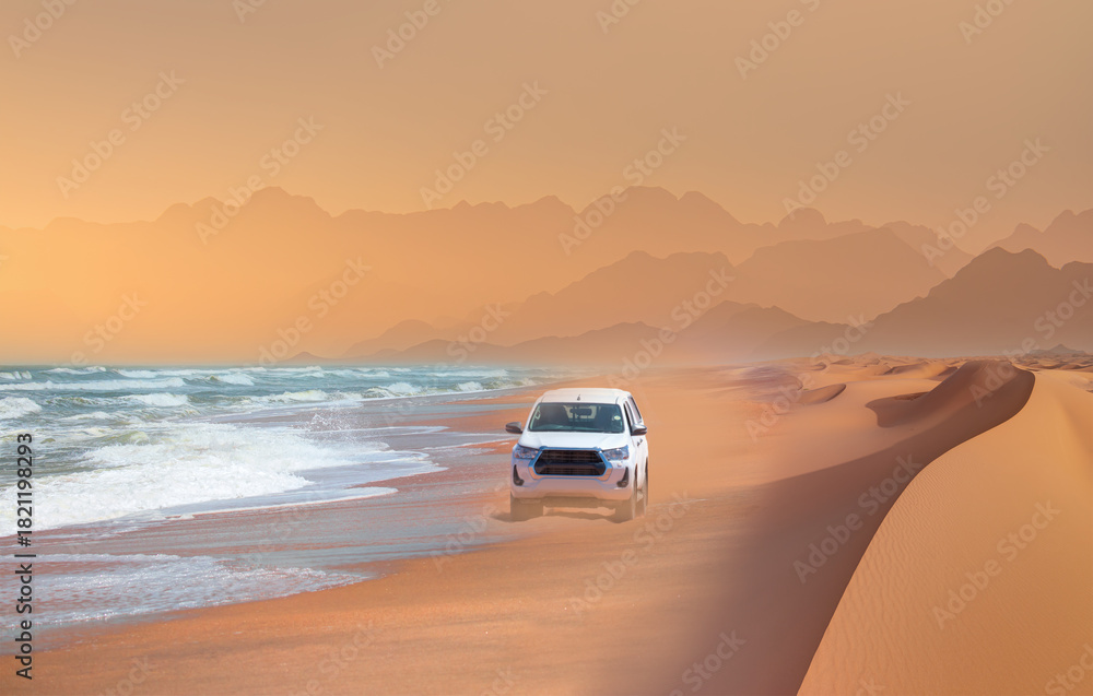 A SUV moving on the orange sands of Skeleton Beach - Namib desert, Namibia