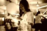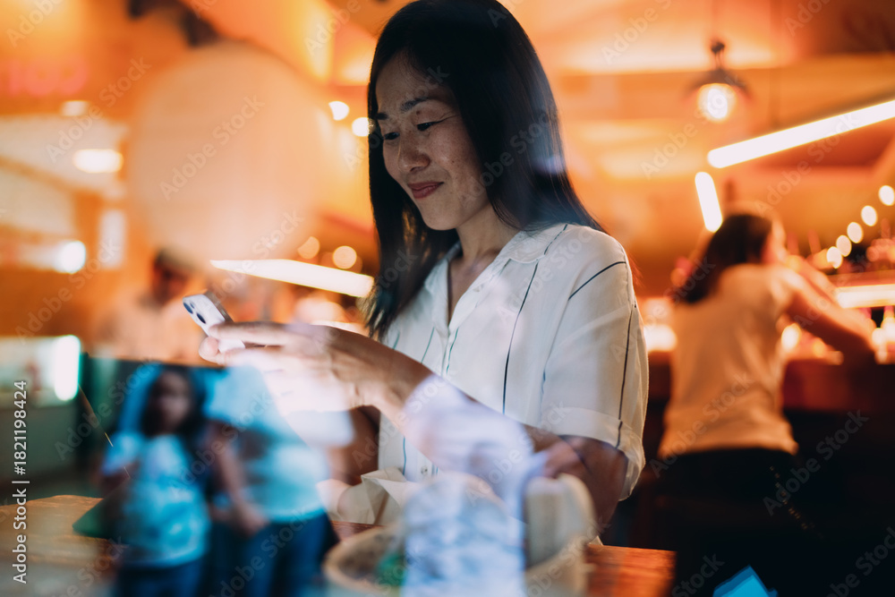 Asian woman interacts with smartphone behind glass, showing abstract reflections of tech culture and mobile immersion in real-time digital environment.