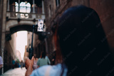 Back view of woman filming with smartphone on selfie stick, merging travel and technology, symbolizing digital presence, modern storytelling and real-time mobile broadcasting.