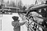 A little child girl feeds carrots to a goat on a snowy winter day. The goat is the symbol of the year 2027.