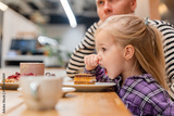 Caucasian Little child girl eating cakes and pastries with her dad in a cafe