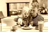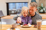 Caucasian Little child girl eating cakes and pastries with her dad in a cafe