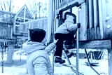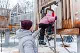 Father helps Little child girl's daughter climb stairs in winter with snow on the playground