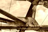 Blue sky seen through open rusted girders urban landscape, horizontal aspect