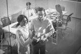 Colleagues standing in office behind glass pane with adhesive notes.