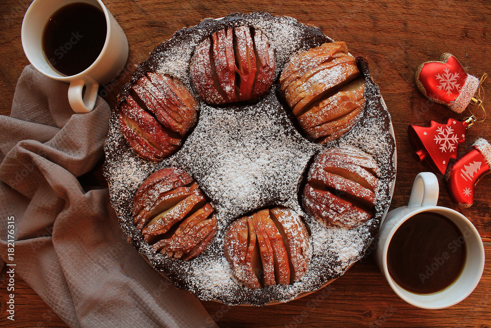 Traditional apple pie, fruit dessert, tart on wooden rustic table. Top view, christmas background