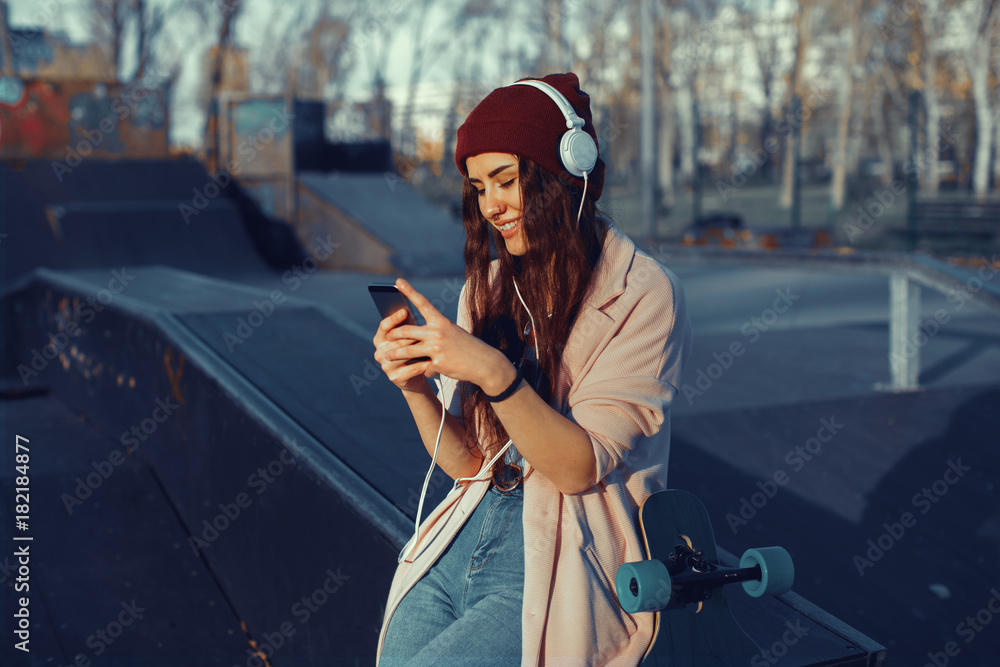 Young urban woman listens to music via headphones and smartphones in skatepark