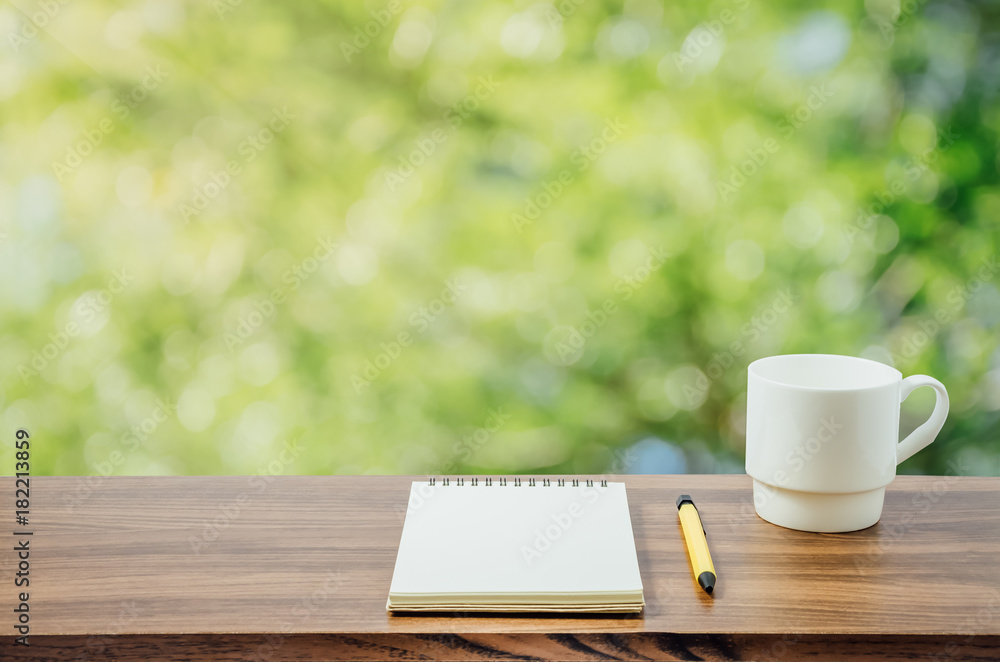 Hot coffee, , notebook and pen in nature background