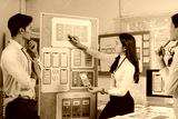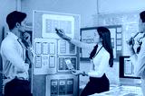 UX UI design team brainstorming ideas and presenting mobile application wireframes during an office meeting for new project development
