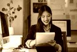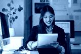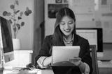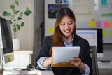 Young professional Asian woman joyfully working, analyzing report papers at her modern office desk, feeling happy and productive