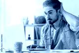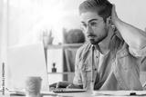 Experienced professional young bearded male enterpreneur ponders on idea for creation successful business, scratches head as looks in laptop computer, searches necessary information, works remotely