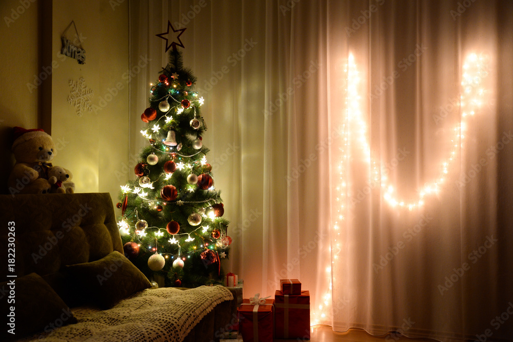 Christmas scene with tree gifts and lighting in night. Home with Christmas decoration and for tree by the window