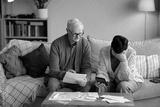 Senior man reading invoice while senior Asian woman holding calculator and covering face, both sitting on sofa analyzing bills and financial documents on coffee table