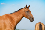 akhal-teke horse portrait on blue sky background